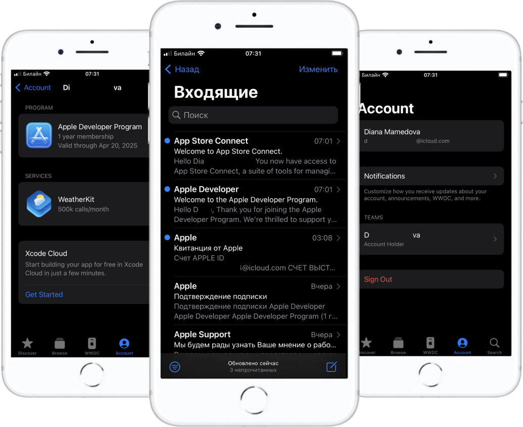 На почту нашего apple id который мы использовали для регистрации придёт 4 письма. Самое первое из которых с темой “Подтверждение подписки”. Далее мы получаем еще 3 письма с темами “Квитанция от Apple”, “Welcome to the Apple Developer Program” и “Welcome to the App Store Connect”. После получения данных писем аккаунт разработчика уже активирован